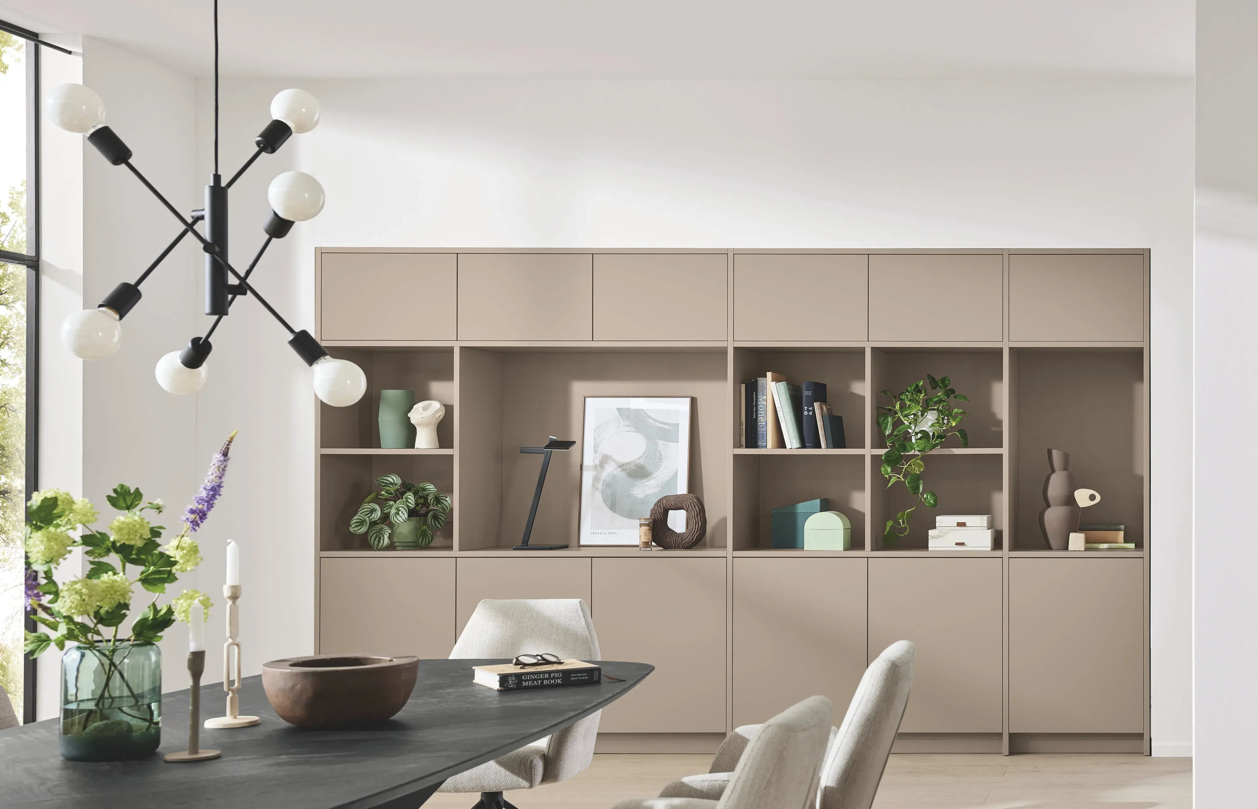 Robust, elegant und pflegeleicht – so präsentiert sich diese Ballerina Küche. Mit der Trendfarbe „Yoko Silk“ in Kombination mit Neo Rustico wird eine warme Atmosphäre geschaffen, die an die 1970er-Jahre erinnert. Die Arbeitsplatte in Taj Mahal Nachbildung und die hochwertigen Vitrinenschränke mit Aluminiumrahmen in Antique Brass setzen elegante Akzente. Flächenbündig eingebaute Spüle und Kochfeld unterstreichen den funktionalen Anspruch. Diese Küche ist ein gelungenes Beispiel für eine moderne Wohnwelt, die sich durch pflegeleichte Materialien, klare Linien und wohnliche Eleganz auszeichnet:
